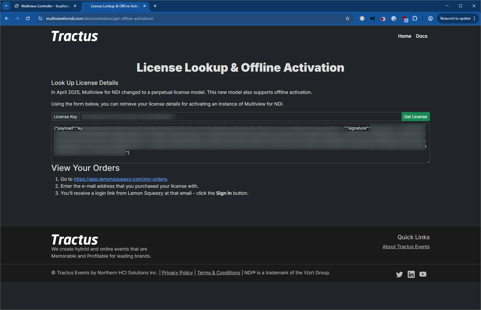 On startup, Multiview for NDI searches the configuration file directory (documented in [configuration-file-locations](https://tractus.gitbook.io/tractus-tools-for-ndi/configuration-file-locations "mention")) for a file called `license.json`. This file contains the signed offline activation details for your multiview instance.