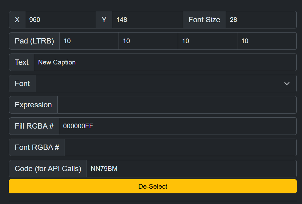 <table><thead><tr><th width="208">Property Name</th><th>Description</th></tr></thead><tbody><tr><td>X &#x26; Y</td><td>Sets the location of this caption.</td></tr><tr><td>Pad (LTRB)</td><td>Sets how much padding should be around the text in this caption. (Left, Top, Right, Bottom)</td></tr><tr><td>Text</td><td>If set, the static text that will be displayed in this caption.</td></tr><tr><td>Font</td><td>If set, the custom TTF font to use for this caption. Custom fonts can be added to the configuration file directory for Multiview.</td></tr><tr><td>Expression</td><td>If set, the dynamic text that will be displayed in this caption. <strong>Do not set this AND Text at the same time. Use one or the other.</strong></td></tr><tr><td>Fill RGBA</td><td>The background color of this caption, given as an HTML hex color.</td></tr><tr><td>Font RGBA</td><td>The text color of this caption, given as an HTML hex color.</td></tr><tr><td>Code</td><td>The unique code of this caption. Used for updating this caption from the HTTP API.</td></tr></tbody></table>